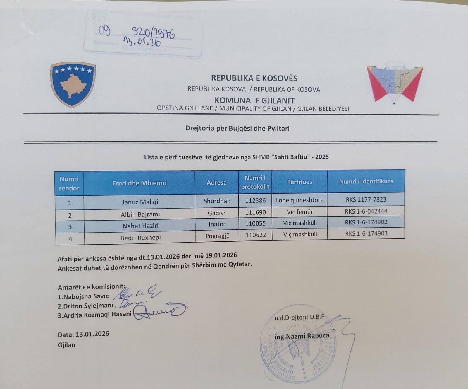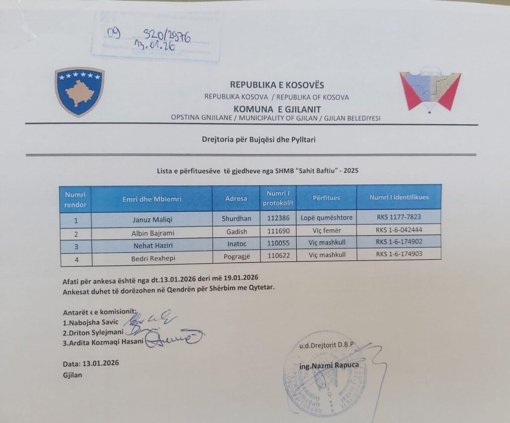 Drejtoria për Bujqësi dhe Pylltari në Gjilan ka publikuar listën e përfituesve në kuadër të programit për mbështetje me gjedhe. Sipas njoftimit zyrtar, në këtë listë janë përfshirë katër përfitues, ndërsa drejtoria ka bërë publike edhe emrat e tyre, duke theksuar transparencën e procesit dhe kriteret e zbatuara gjatë përzgjedhjes.