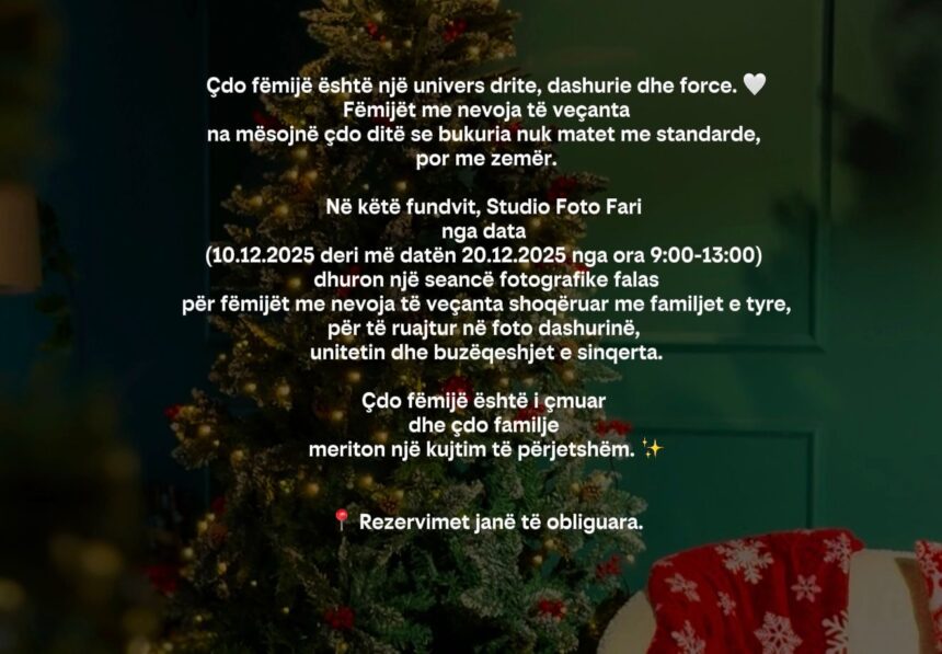 Në këtë fundvit, Studio Foto Fari, nga data 10.12.2025 deri më 20.12.2025, nga ora 09:00 – 13:00, dhuron një seancë fotografike falas për fëmijët me nevoja të veçanta, së bashku me familjet e tyre.