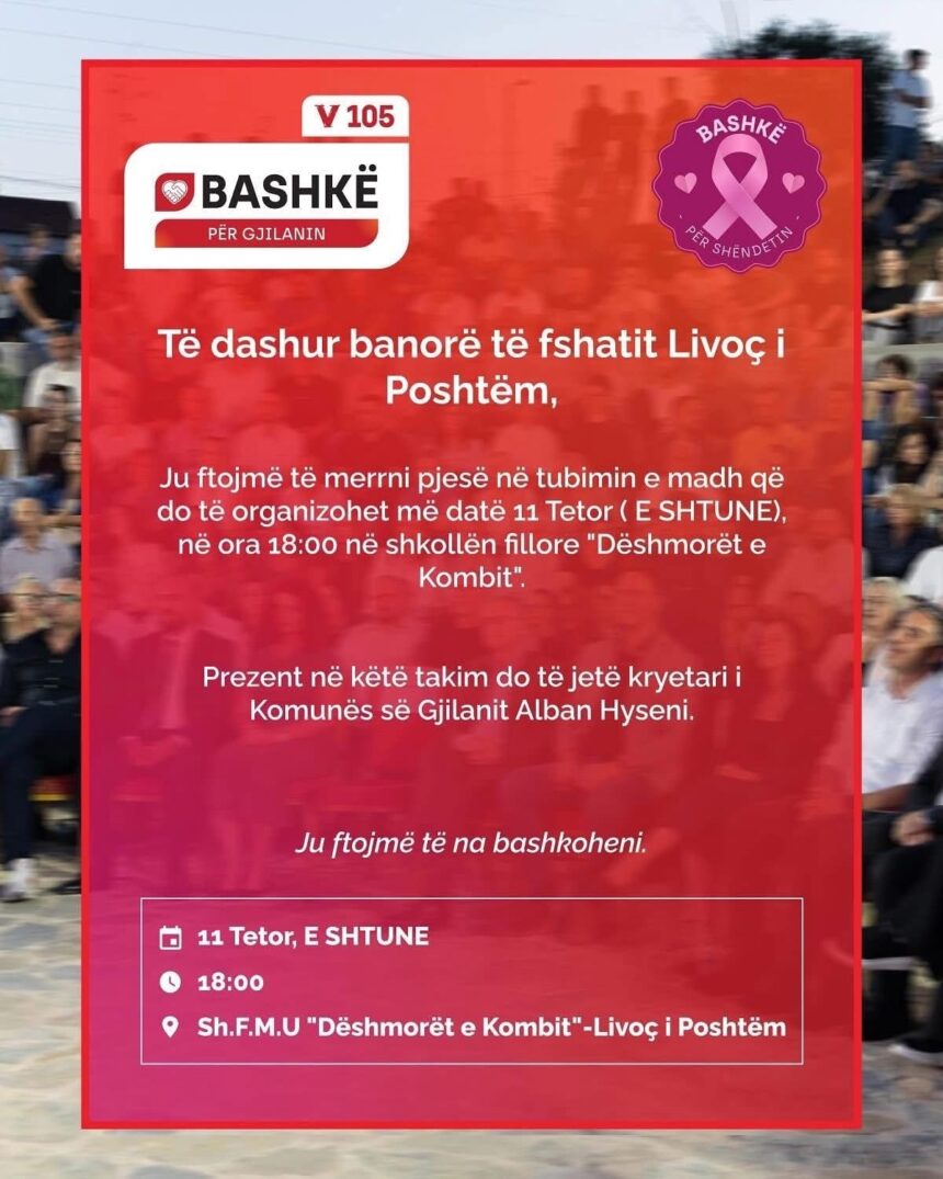 Të dashur banorë të fshatit Livoç i Poshtëm dhe të lagjeve “Dheu i Bardhë” dhe “Baja” ju ftojmë të na bashkoheni në dy tubimet e mëdha që do të mbahen sot, më 11 tetor (e shtunë):