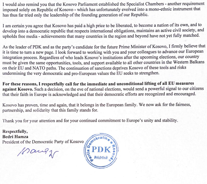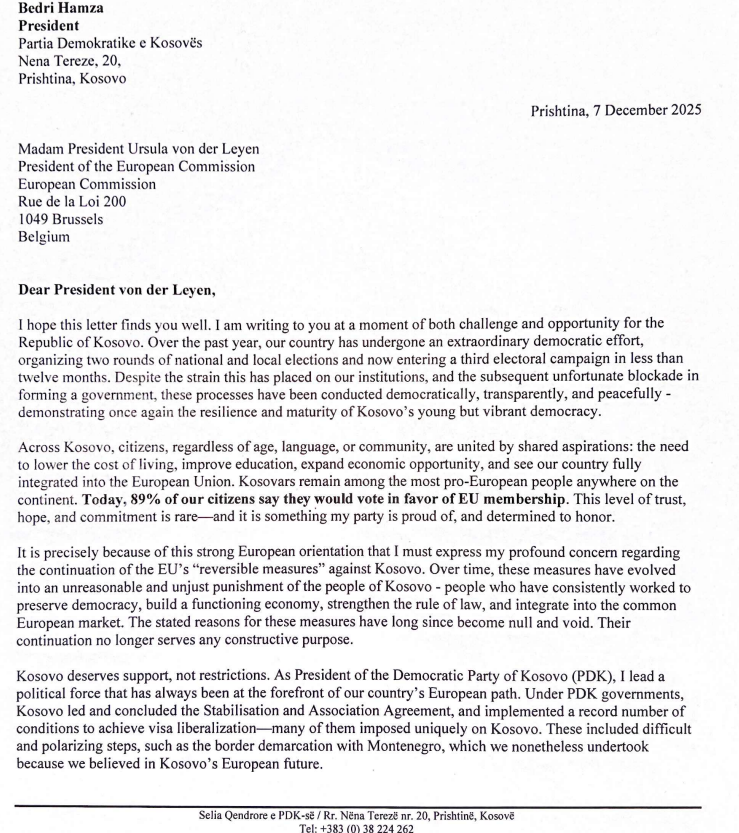 Kryetari i Partisë Demokratike të Kosovës, Bedri Hamza, ia ka dërguar një letër zyrtare Presidentes së Komisionit Europian, Ursula von der Leyen, ku kërkon heqjen e menjëhershme dhe të pakushtëzuar të masave të BE-së ndaj Kosovës.