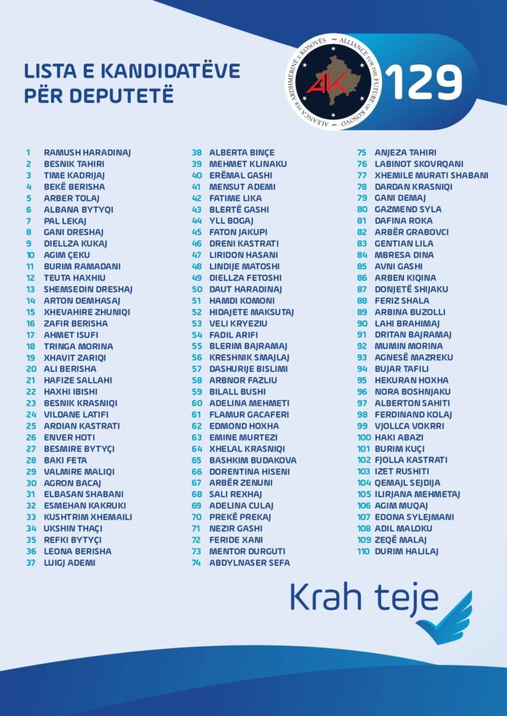 Kryetari i AAK-së, Ramush Haradinaj, ka publikuar listën e partisë së tij me 110 kandidatë për deputetë për zgjedhjet e 28 dhjetorit 2025.