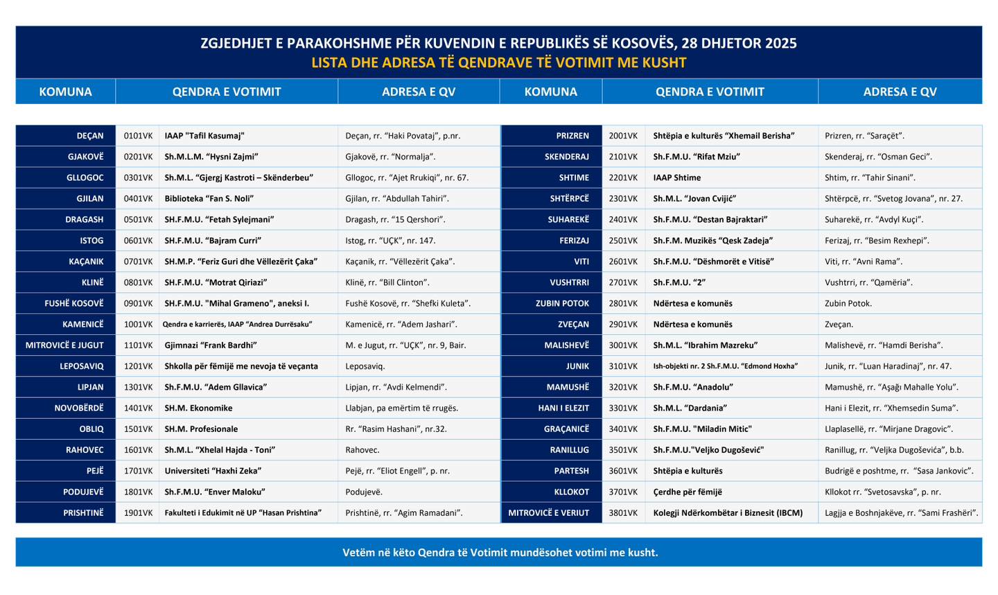 Komisioni Qendror i Zgjedhjeve (KQZ) ka njoftuar se në zgjedhjet e parakohshme për Kuvendin e Republikës së Kosovës, që do të mbahen më 28 dhjetor 2025, qytetarët do të kenë mundësi të votojnë me kusht në cilëndo komunë të vendit.