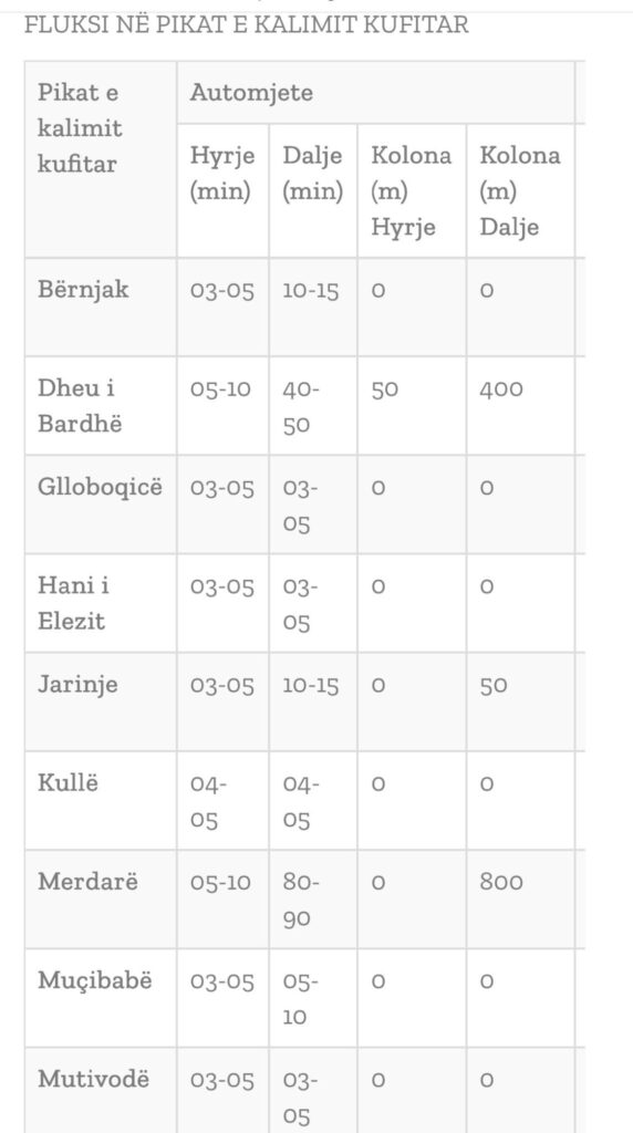 Lajme Kthimi i mërgimtarëve, pritje më të gjata në Merdare – kjo është gjendja në pikat kufitare Përditësimi i fundit: January 4, 2026 10:49 am RadioStar Shpërndaje Shpërndaje Qendra Kombëtare për Menaxhim Kufitar ka përditësuar të dhënat mbi pritjet në kufi. - Advertisement - Aktualisht ka pritje deri në 50 minuta për të dalë nga Kosova nëpërmjet Dheut të Bardhë, 90 minuta në Merdar. Më pikat tjera situata është më e qetë. Screenshot Anëtarët e Shoqatës Down Syndrome Kosova në Gjilan, tani ditëlindjet do ti festojn me Pastiqerin “Bujana” Fisi kishte ëndrra dhe dëshira për të jetuar Të premten në Gjilan nis faza e parë e dezinsektimit hapësinor Tubimet partiake pa maskë e distancë po rrezikojnë shëndetin e qytetarëve Kjo është gjendja në vendkalimet kufitare Artikulli i mëparshëm Parashikimi i motit për sot Artikulli tjetër “ViOR by Astoria” – Sonte ju argëton Butrint Rashiti Stay Connected70KLike141NdiqniYoutubeSubscribeLatest News Ministrja Arbërie Nagavci njofton: Mësimi fillon më 12 janar 2026 Lajme Lajm i rëndë: Ndërron jetë profesoresha e muzikës, Afërdita Ismajli Lajme KQZ: Numërohen 49 nga 57 vendvotime me kusht, pritet përmbyllja e procesit sot Lajme Sallat plot, kutitë zbrazët – LDK mbetet me vetëm 33 vota në Gjenevë Lajme