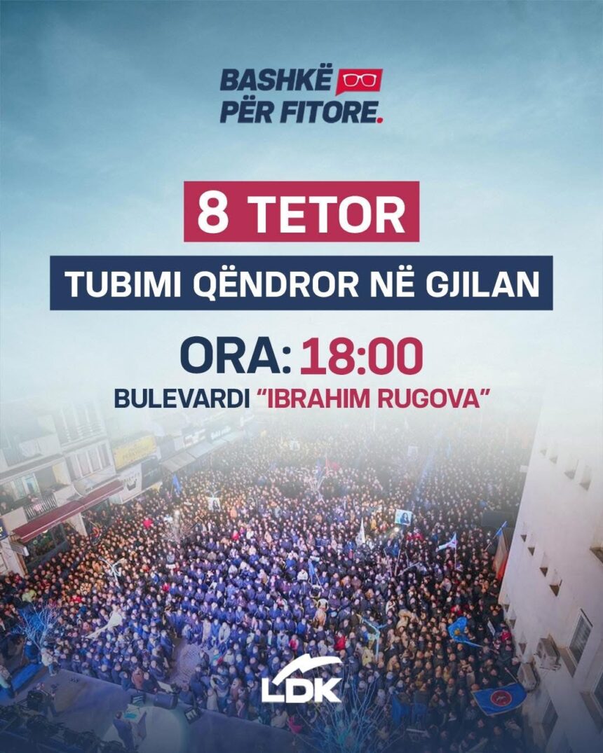 Lidhja Demokratike e Kosovës (LDK) ka njoftuar se më 8 tetor do të mbajë tubimin qëndror në Gjilan, në Bulevardin “Ibrahim Rugova”, me fillim nga ora 18:00.