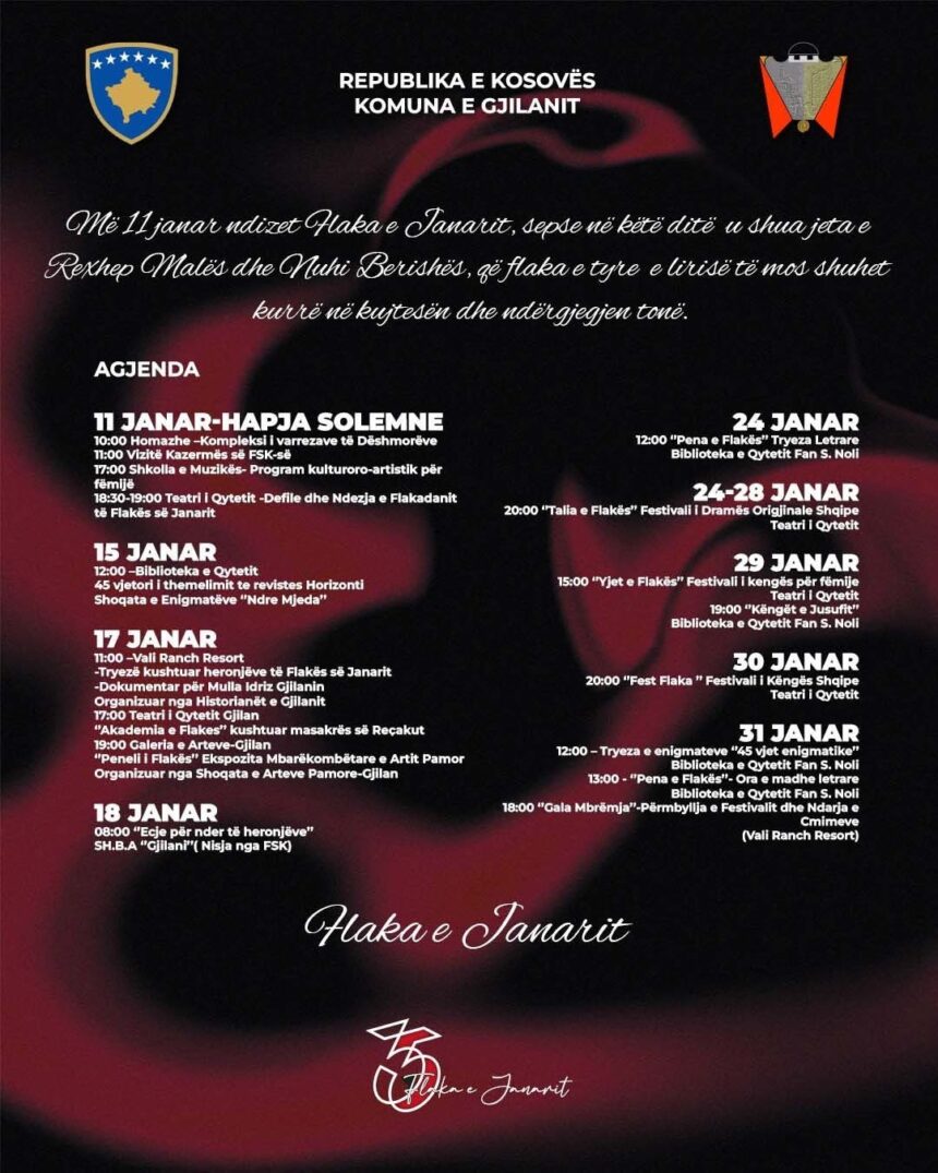 Manifestimi tradicional “Flaka e Janarit” pritet të fillojë më 11 janar, duke sjellë një sërë aktivitetesh kulturore, artistike, letrare dhe përkujtimore, të cilat zhvillohen në kuadër të këtij manifestimi të rëndësishëm kombëtar në Gjilan.