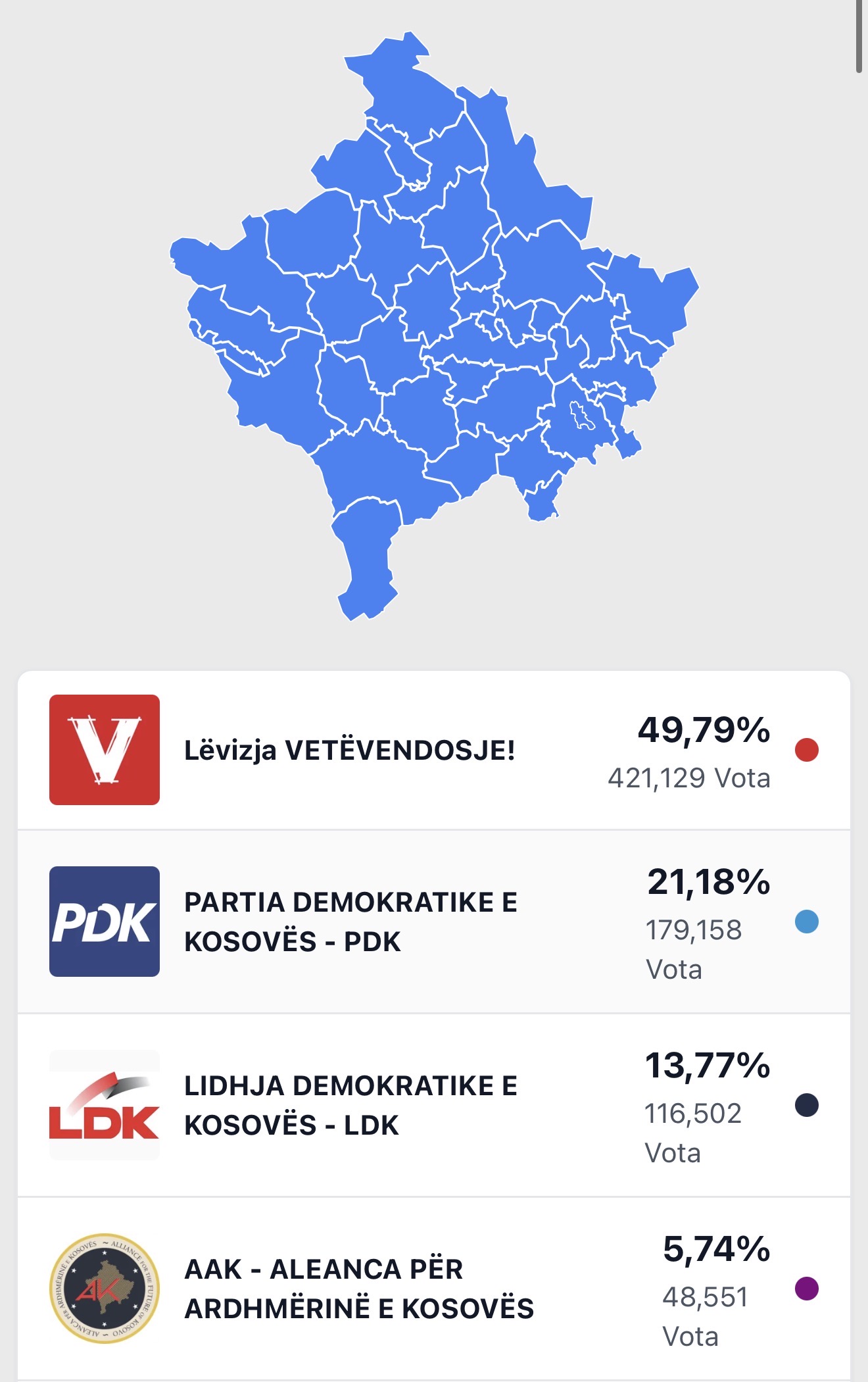 Lëvizja Vetëvendosje deri tash ka 49.79%;