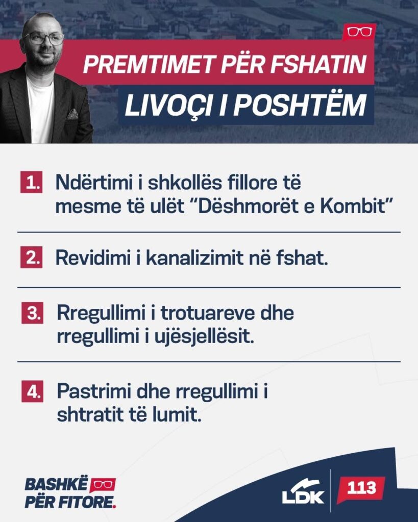 Kandidati i Lidhjes Demokratike të Kosovës (LDK) për kryetar të Komunës së Gjilanit, Arbër Ismajli, ka prezantuar premtimet e tij kryesore për fshatin Livoç i Poshtëm, duke vënë theksin në zhvillimin e infrastrukturës dhe përmirësimin e kushteve të jetesës për banorët e këtij lokaliteti.