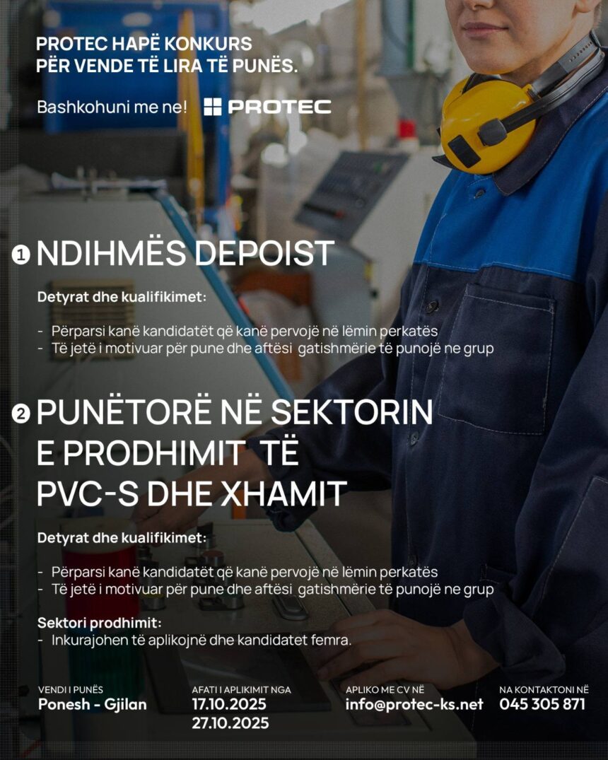 Kompania PROTEC, e njohur për standardet e saj të larta në sektorin e prodhimit dhe përkushtimin ndaj cilësisë, shpall konkurs për pozitat e lira të punës si më poshtë: