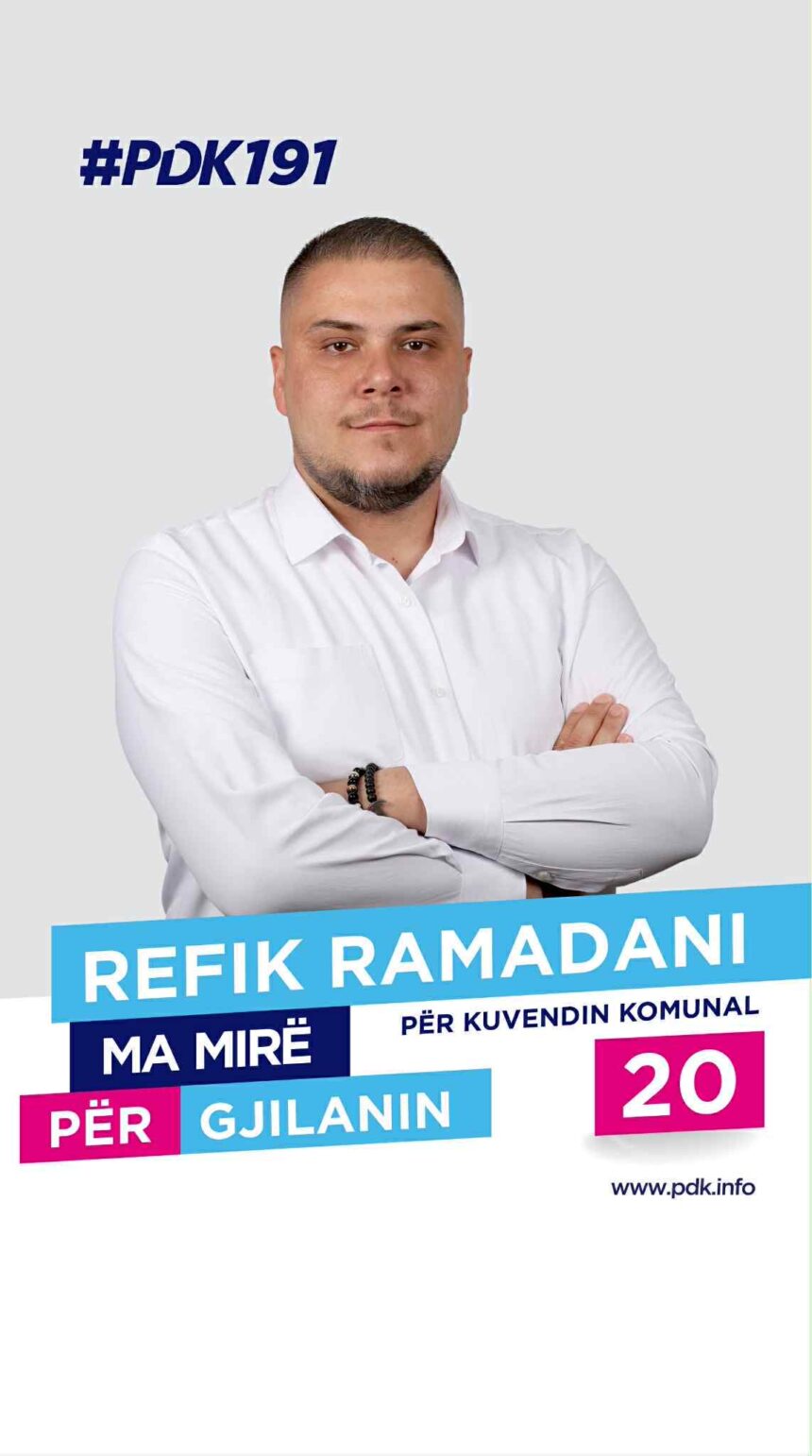 Kandidati për këshilltar komunal nga Partia Demokratike e Kosovës (PDK), Refik Ramadani, është pritur me entuziazëm nga banorët e lagjeve Dheu i Bardhë dhe Dardania, në një takim të hapur të mbajtur bashkë me kandidatin për kryetar të Komunës së Gjilanit, Riad Rashiti, dhe kolegët tjerë të listës së PDK-së. Takimi ishte pjesë e turit të prezantimeve që po zhvillon PDK në kuadër të fushatës zgjedhore për zgjedhjet e 12 tetorit.