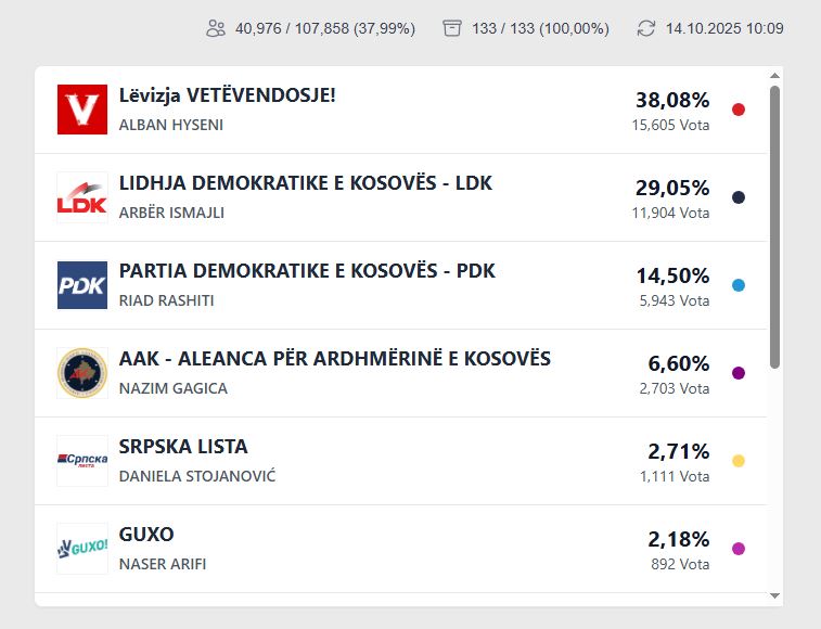 Në Gjilan ka përfunduar procesi i numërimit të votave për zgjedhjet e Asamblesë Komunale. Sipas të dhënave të fundit nga Komisioni Qendror i Zgjedhjeve, Vetëvendosja kryeson me një mbështetje prej 38,08%, duke siguruar gjithsej 15,605 vota.