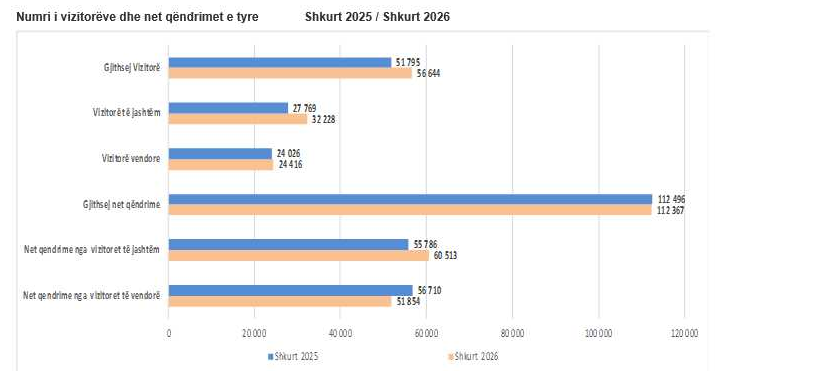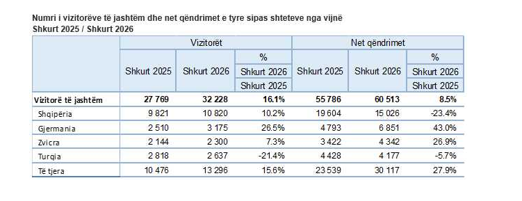 Sa u përket vizitorëve të huaj, krahasuar me periudhën paraprake (Shkurt 2025) pati një rritje të vizitorëve për 16,1 %.