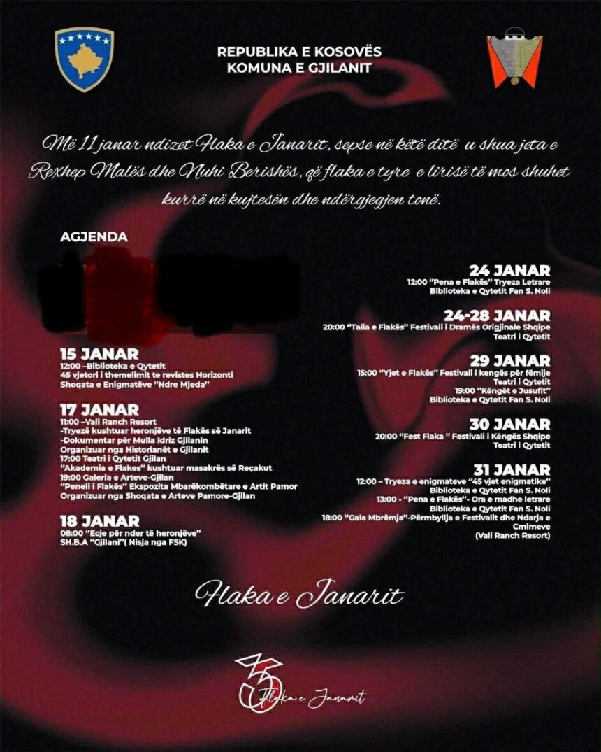 Po vazhdojnë aktivitetet në kuadër të manifestimit tradicional “Flaka e Janarit”, edicioni i 35-të, në nderim të heronjve, dëshmorëve dhe martirëve të kombit ndër breza, nën përkujdesjen e kryetarit të Komunës së Gjilanit Alban Hyseni dhe Drejtorisë për Kulturë, Rini e Sport.