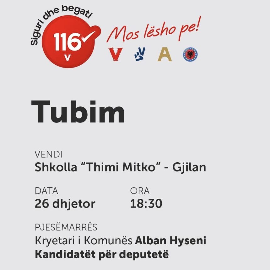 Në këto tubime do të marrë pjesë Kryetari i Komunës së Gjilanit, z. Alban Hyseni, së bashku me kandidatët për deputetë, të cilët do t’u drejtohen qytetarëve me mesazhe dhe prezantime rreth angazhimeve dhe vizionit të tyre.