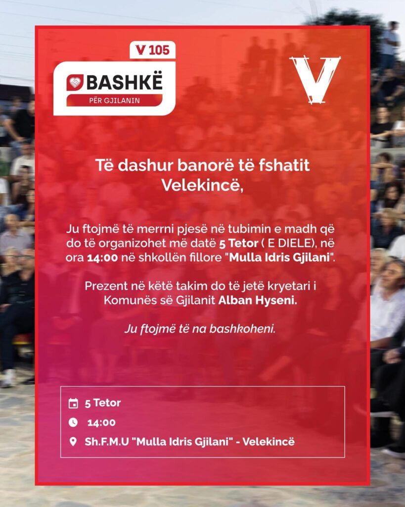 Lajme VV Gjilan fton banorët e Velekincës në takim: “Bashkë për fitoren e 12 tetorit” Përditësimi i fundit: October 5, 2025 12:21 pm RadioStar Shpërndaje Shpërndaje Lëvizja Vetëvendosje, dega në Gjilan, do të mbajë sot një takim me banorët e Velekincës. - Advertisement - Tubimi do të zhvillohet në shkollën fillore “Mulla Idris Gjilani”, në orën 14:00, ku pritet të diskutohet për vizionin dhe fitoren e 12 tetorit. BSPK mban nesër protestë, kërkon rritjen e pagës për 100 euro për çdo të punësuar në sektorin publik Hovenier: SHBA nuk mbështet Asociacion që veç edhe një grimcë mund t’i ngjajë Republikës Srpska Rubin i prerë: Përvoja ime 25-vjeçare më ka mësuar që këto farë akuzash të llojllojshme janë kampanjë ruso–serbe Xhamia e Lagjes Dheu i Bardhë dhuron një makineri (fotokopje) së bashku me disa bamirës të tjerë. BE reagon për ndalimin e autobusëve me kosovarë në kufi: Serbia ka shkelur marrëveshjen për lëvizjen e lirë Artikulli i mëparshëm Të hënën mbahet samiti Brdo-Brioni, në Durrës Stay Connected70kLike141NdiqniYoutubeSubscribeLatest News Të hënën mbahet samiti Brdo-Brioni, në Durrës Lajme Arbër Ismajli: Kjo është epoka e rinisë gjilanase! Lajme Haziri: Uroj që të mos presim gjithmonë që situatat politike t’i zgjidh Gjykata Kushtetuese Lajme Limaj: Do ta respektojmë aktgjykimin e Kushtetueses – Basha të japë dorëheqje Lajme